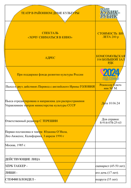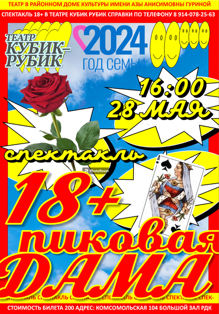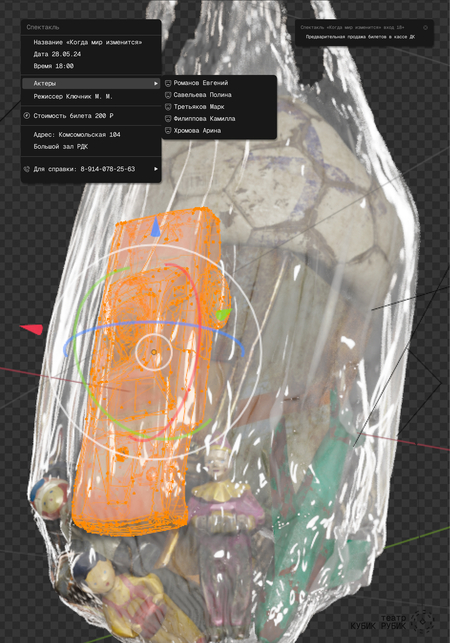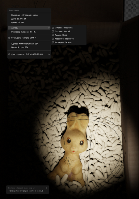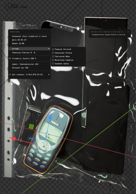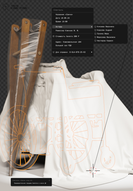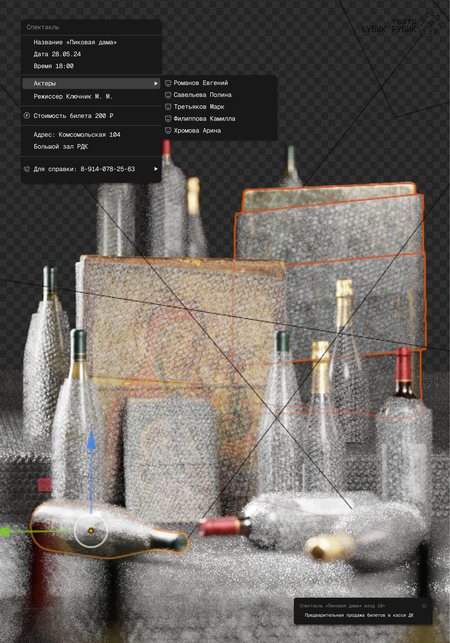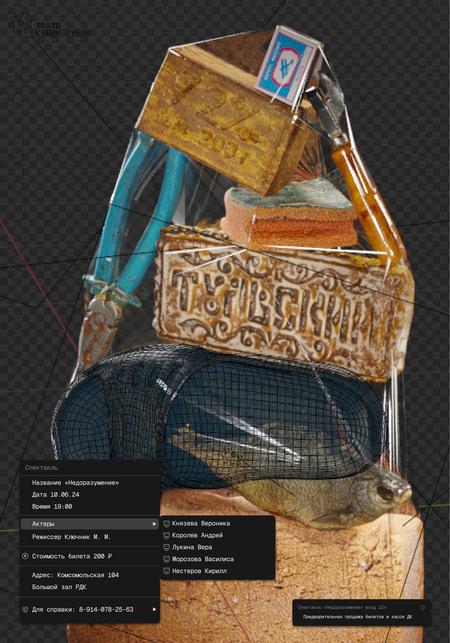Заказчиком выступает сельский театр «Кубик Рубик». В проекте поставлена задача создать систему афишных плакатов. Были разработаны две серии работ, каждая из которых показывала разные перспективы: взгляд режиссера внимание на художественном видении постановок, раскрытие ключевой идеи и эмоции, которые режиссер стремился донести до аудитории и взгляд зрителя.