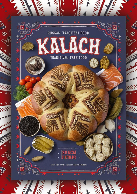 poster ad for ethnic russian tradiotional cuisine KALACH simple traditional patterns photorealistic food