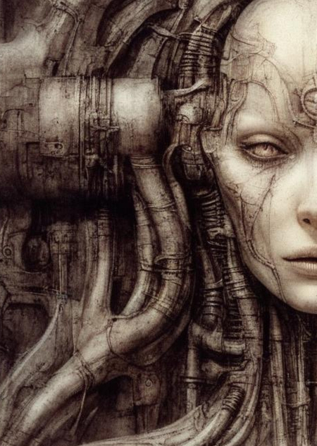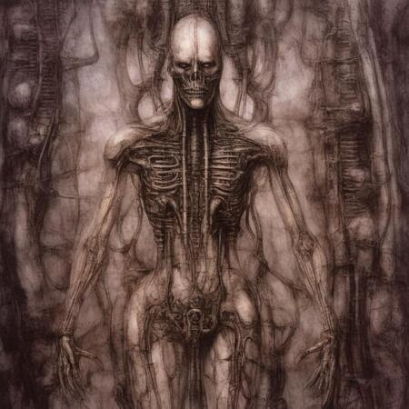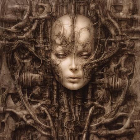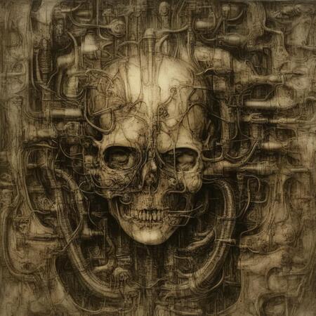Promt: (1) A close-up of a biomechanical face, half-human half-machine, intricate metallic sinews, dark surrealism, Giger-inspired (2) A surreal cybernetic skull with organic wiring, glowing cavities, dark gothic atmosphere, hyper-detailed, H.R. Giger style