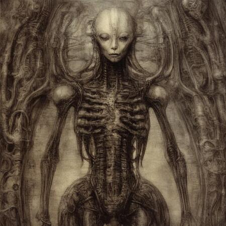 Promt: (1) A biomechanical humanoid with elongated limbs, metallic exoskeleton fused with organic tissue, glowing veins, dark surreal background, H.R. Giger style, hyper-detailed, eerie atmosphere (2) An androgynous alien creature with a biomechanical exoskeleton, intricate rib-like structures, glowing eyes, dark cosmic horror aesthetic, Giger-esque