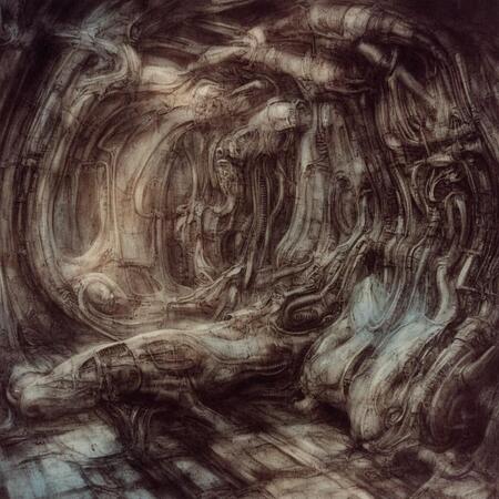 Promt: (1) A derelict spaceship interior with biomechanical walls, fleshy tendrils, eerie blue glow, H.R. Giger aesthetic, sci-fi horror (2) A nightmarish alien vessel with ribcage-like corridors, organic machinery, surreal lighting, Giger-esque design
