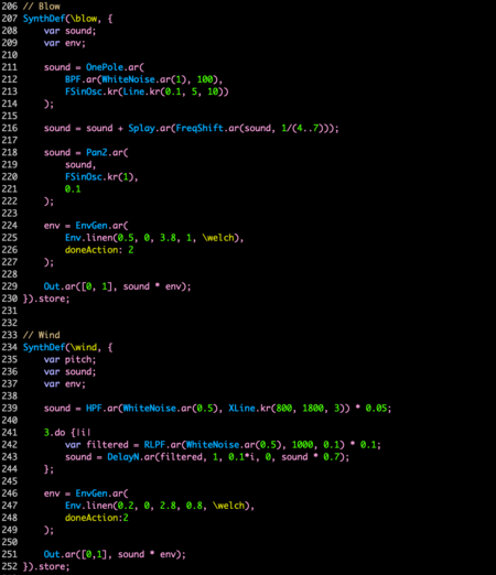 Этот код представляет собой мощный набор инструментов для создания атмосферных и текстурных звуковых ландшафтов. Каждый синтезатор может быть использован отдельно или комбинирован с другими для создания более сложных звуковых эффектов.