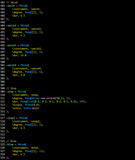 Pbind: Это способ связывать параметры синтезатора с временной последовательностью значений. Например: ~swish запускает SynthDef (\swish) и задает его параметры, такие как \degree (нота) и \dur (длительность). ~sizuku создает капли, используя разные высоты звука и ритмические последовательности.