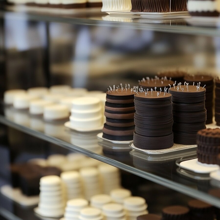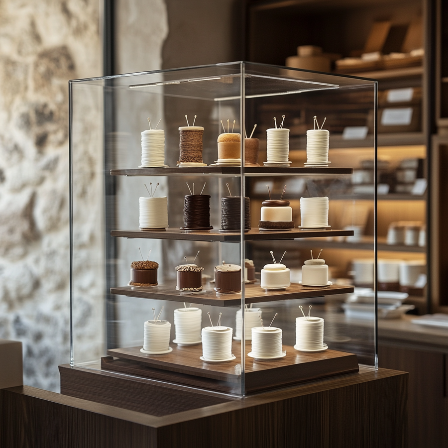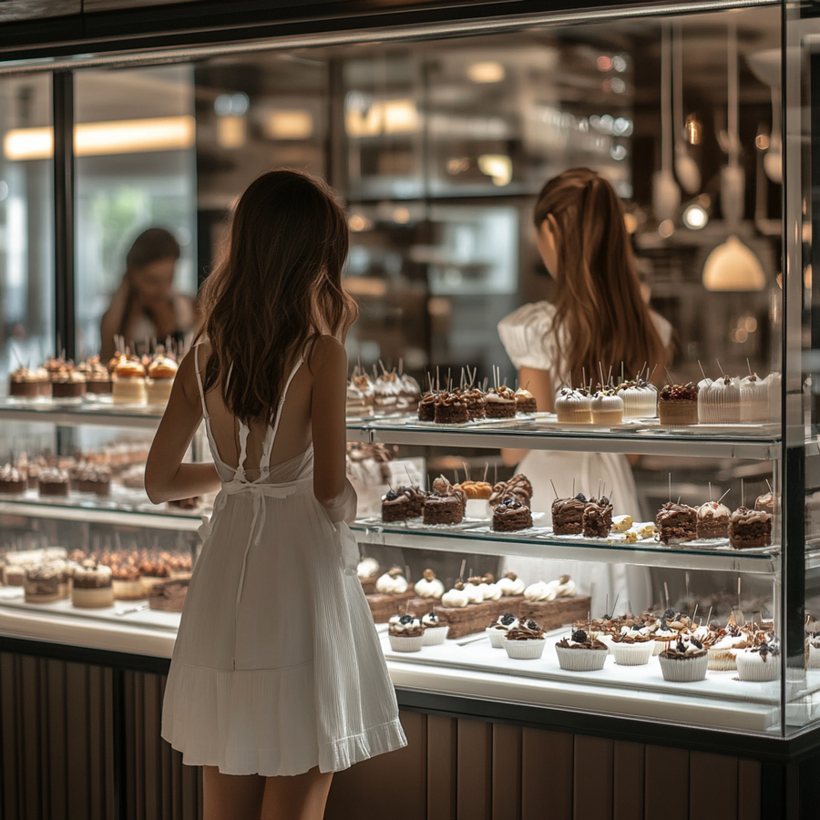4 Prompt: Стеклянная витрина в дорогом ресторане наполненная десертами, оформленная в стиле минимализм. На витрине каждый десерт сделан в виде отчетливой формы шпульки. Каждый десерт выполнен в форме шпулек, что придает им уникальность и креативность. Десерты сделаны из белого и черного шоколада, каждый десерт оформлен с учетом деталей: например, шоколадные нити, обвивающие шпульку, или маленькие элементы, напоминающие иголки, этот десерт вызывает восхищение и желание съесть. 5 Prompt: Счастливые и красивые девушки с натуральной красотой, одетые в одежду в стиле тихая роскошь, в светлых тонах, они стоят и с восхищением смотрят на эту стеклянную витрину в дорогом ресторане наполненную десертами, оформленную в стиле минимализм. На витрине каждый десерт сделан в виде отчетливой формы шпульки. Каждый десерт выполнен в форме шпулек, что придает им уникальность и креативность. Десерты сделаны из белого и черного шоколада, каждый десерт оформлен с учетом деталей: например, шоколадные нити, обвивающие шпульку, или маленькие элементы, напоминающие иголки, этот десерт вызывает восхищение и желание съесть, это можно увидеть на лицах счастливых девушек.