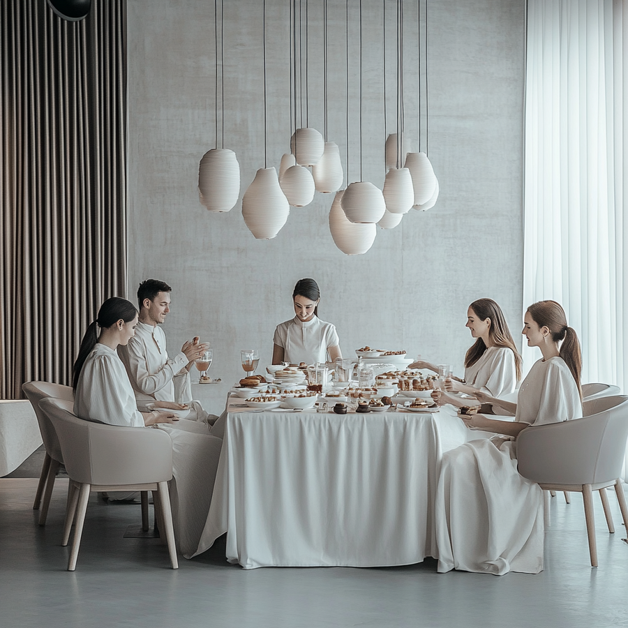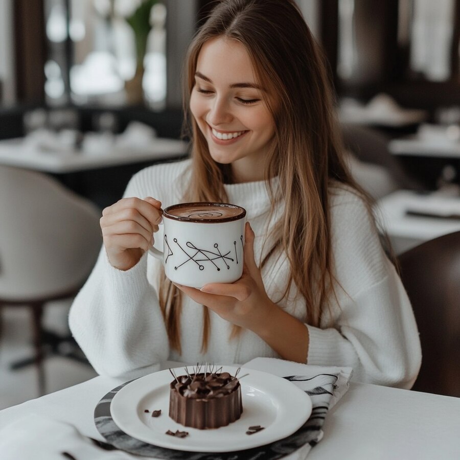 1 Prompt: Компания красивых людей одетых в одежду в светлых тонах в стиле тихая роскошь, сидят за большим столом, в красивом дорогом ресторане выполненном в стиле минимализм в светло серых, белых тонах. 2 Prompt: Счастливая девушка с натуральной красотой пьет горячий шоколад в красивом дорогом ресторане, выполненном в стиле минимализм с использованием светло серых и белых тонов. На столе лежит салфетка с черно белой графикой шпульного колпачка и красивый акцентный десерт из в виде шпульки из черного шоколада, шоколадные нити, обвивают шпульку, а мелкие элементы, напоминают иголки. 3 Prompt: Стеклянная витрина в дорогом ресторане наполненная десертами, оформленная в стиле минимализм. На витрине каждый десерт сделан в виде отчетливой формы шпульки. Каждый десерт выполнен в форме шпулек, что придает им уникальность и креативность. Десерты сделаны из белого и черного шоколада, каждый десерт оформлен с учетом деталей: например, шоколадные нити, обвивающие шпульку, или маленькие элементы, напоминающие иголки, этот десерт вызывает восхищение и желание съесть.