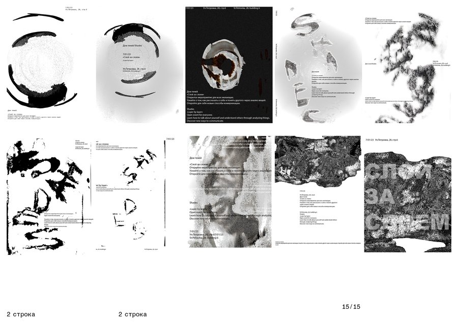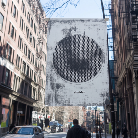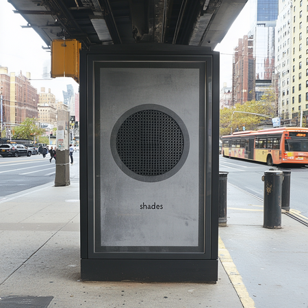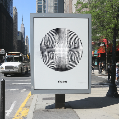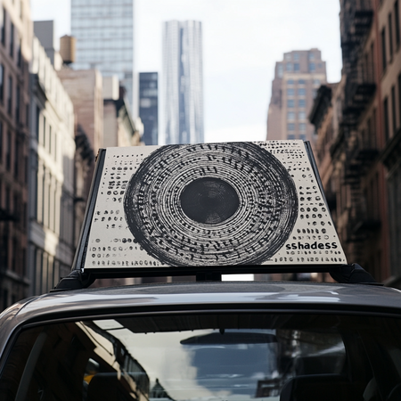 Prompt: плакат серого цвета, на улице в Нью-Йорке с гравировкой графики круглой шпульки с дырочками, выполненной отпечатком шпульки чернилами серого цвета. С легко читаемой типографикой черного цвета «shades» Prompt: реклама в виде постера сверху машины серого цвета в Нью-Йорке, с гравировкой графики круглой шпульки с дырочками, выполненной отпечатком шпульки чернилами серого цвета. С легко читаемой типографикой черного цвета «shades»