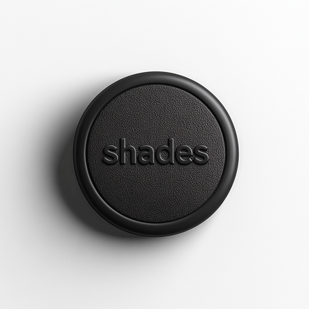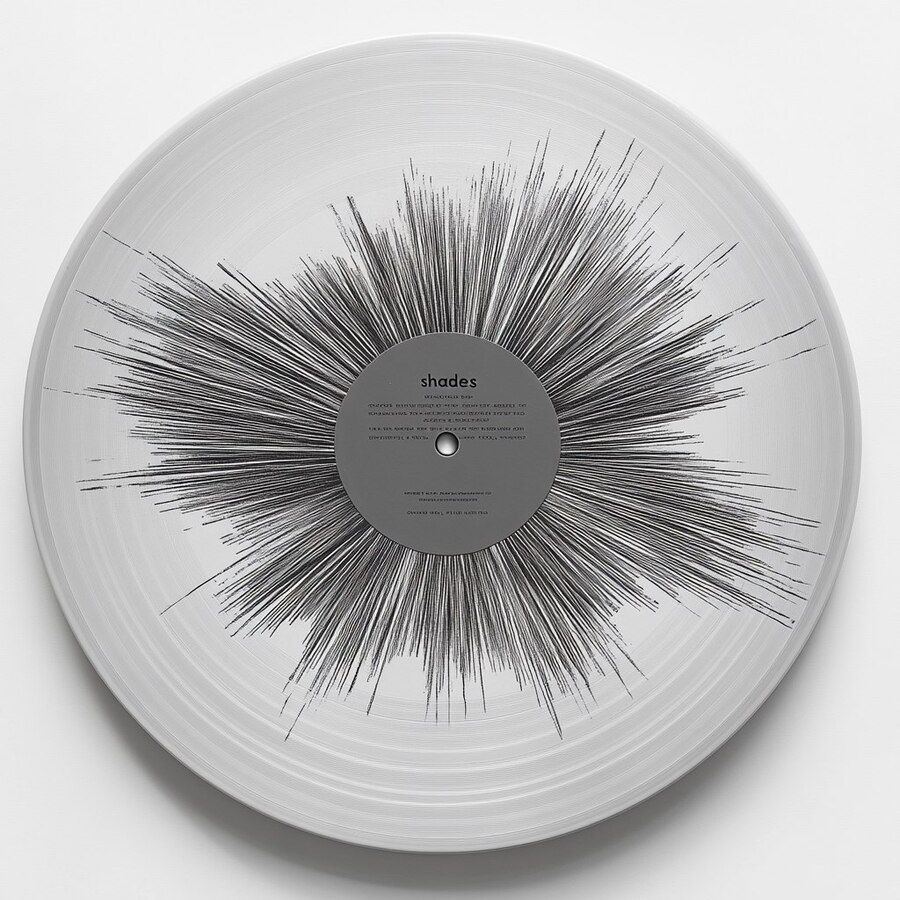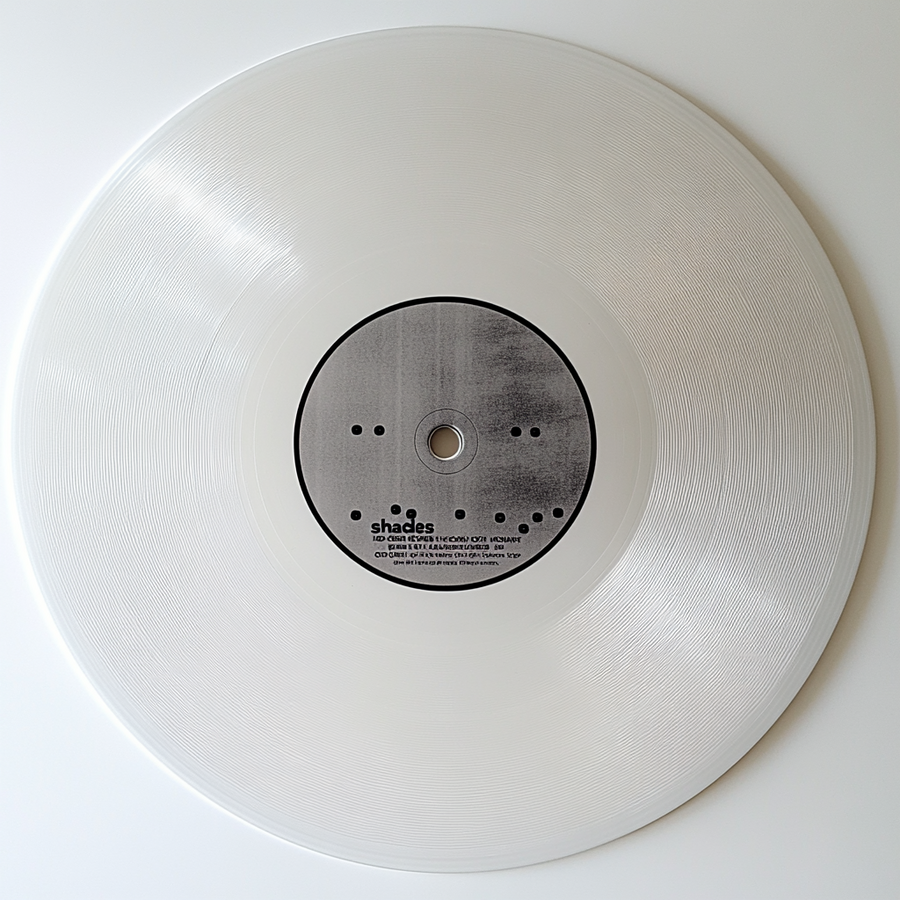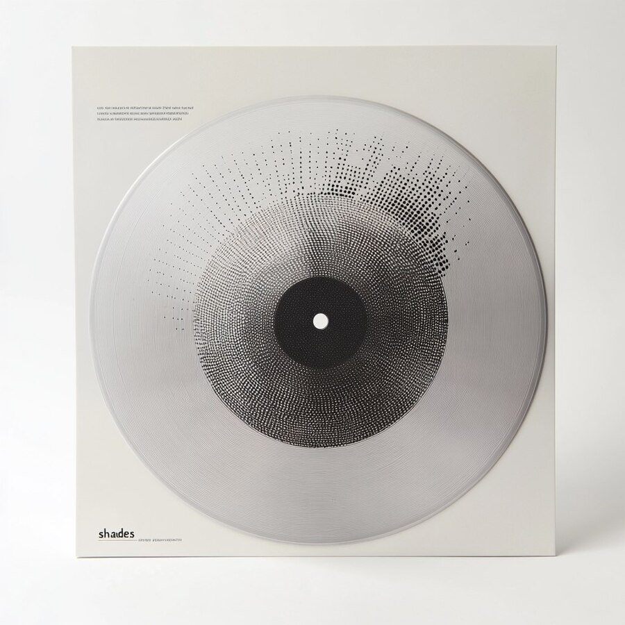 Prompt: белая виниловая пластинка на чистом белом фоне с круглыми дырочками от шпульки на сером фоне, дырочки черного цвета.Нанесена легко читаемая типографикой черного цвета «shades»