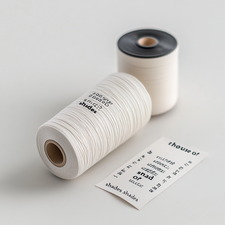 Prompt: минималистичная бирка для одежды с текстурой, на чистом белом фоне. С легко читаемой типографикой «house of shades» и «shades» Prompt: На чистом белом фоне лежит катушка и чек с легко читаемой типографикой «house of shades» и «shades».