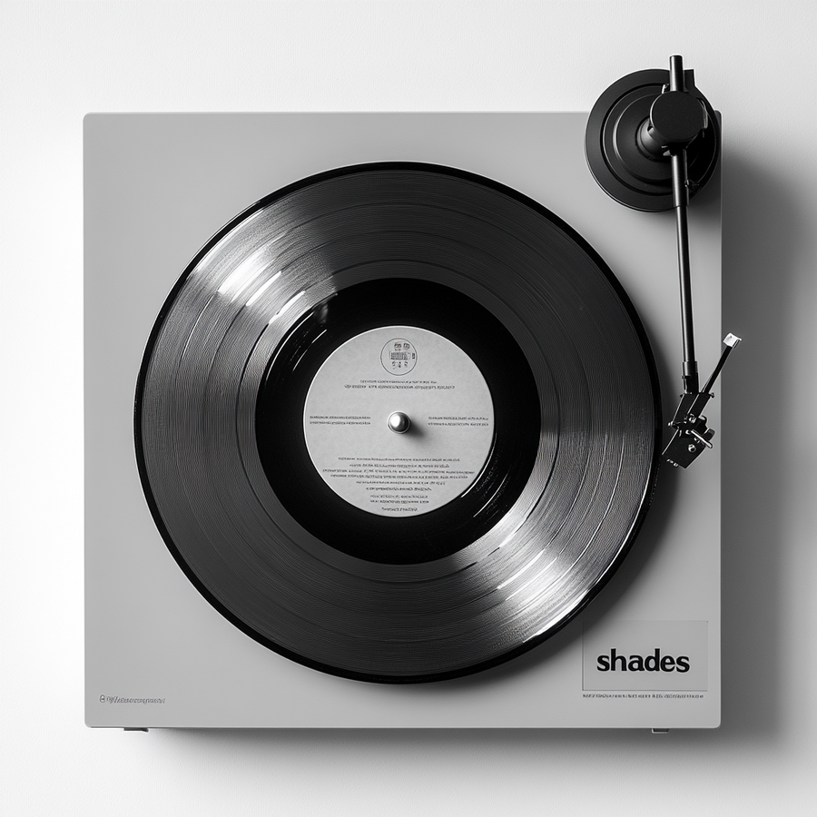 Prompt: виниловый проигрыватель серого цвета, на чистом белом фоне с гравировкой графики круглой шпульки с дырочками, выполненной отпечатком шпульки чернилами серого цвета. С легко читаемой типографикой черного цвета «shades»