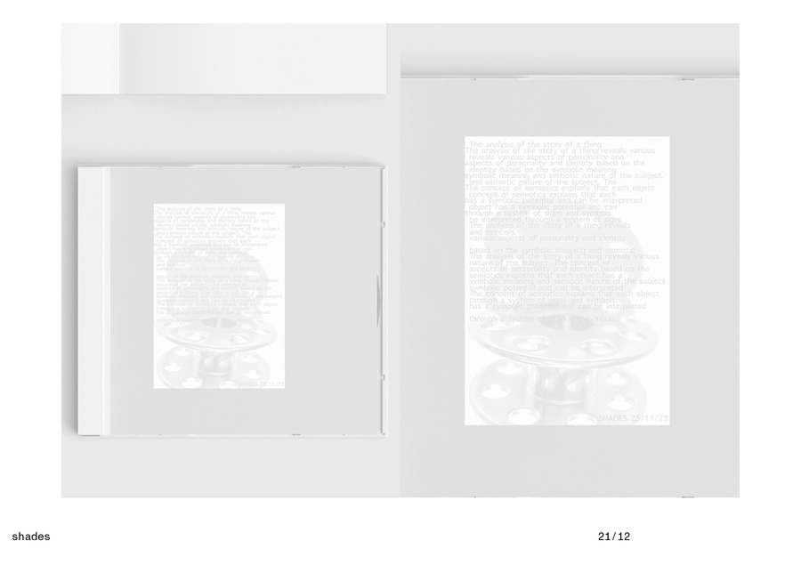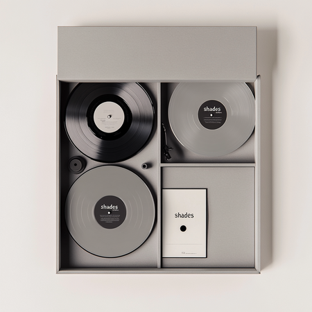 В старом проекте не предусматривалась разработка продукта, но, так как shades — это пространство, в котором люди обмениваются своими вещами, рассказывая историю, я решила пофантазировать о наборе из разных персонализированных продуктов в едином стиле, доступном для продажи. SHADES — фирменный набор, в который входит виниловый проигрыватель, виниловая пластинка и открытка «shades».