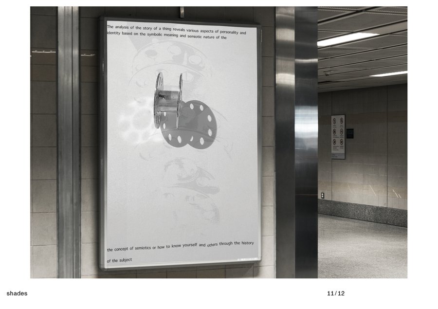 Prompt: реклама на дверях минималистичного серого лифта, с гравировкой графики круглой шпульки с дырочками, выполненной отпечатком шпульки чернилами серого цвета. С легко читаемой типографикой черного цвета «shades»