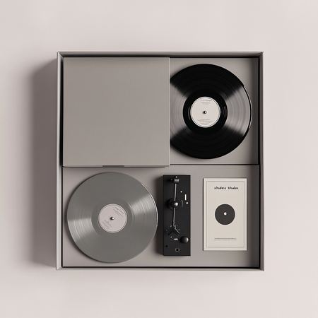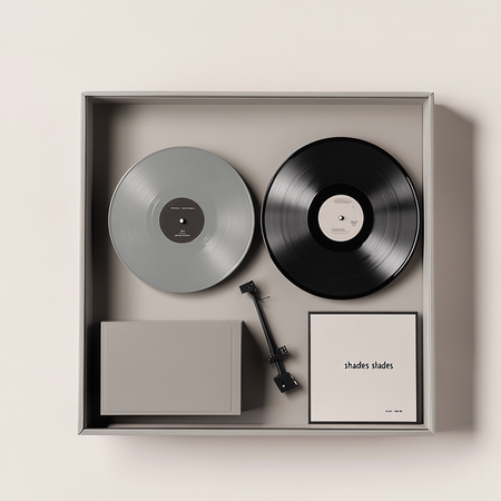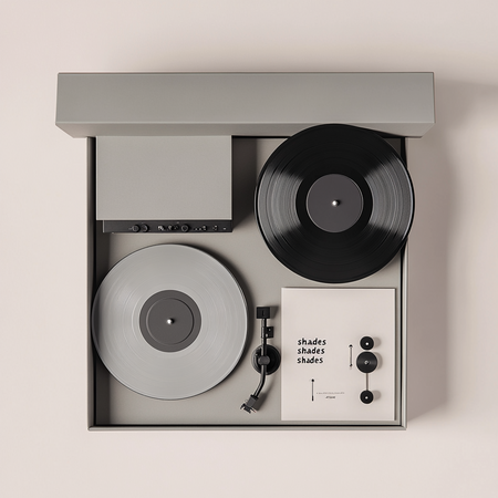 Prompt: Стильный минималистичный набор предметов для дома выполненный в светло серых тонах, он лежит в красивой светло серой открытой коробке, набор включает в себя виниловые пластинки с надписями «shades», виниловый черный проигрыватель, с надписью «shades», открытка с графикой шпульки с дырочками.