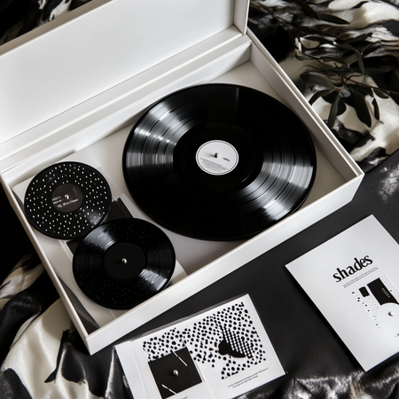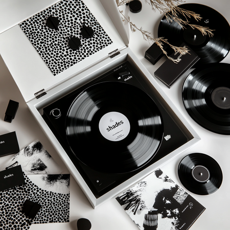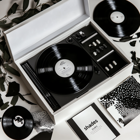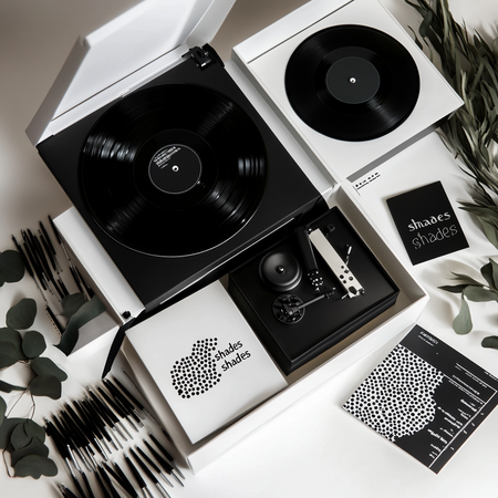 Prompt: Стильный минималистичный набор предметов для дома выполненный в черно белых оттенках, он лежит в красивой белой открытой коробке, набор включает в себя виниловые пластинки с надписями «shades», виниловый черный проигрыватель, с надписью «shades», открытка с графикой рисунком шпульки с дырочками.