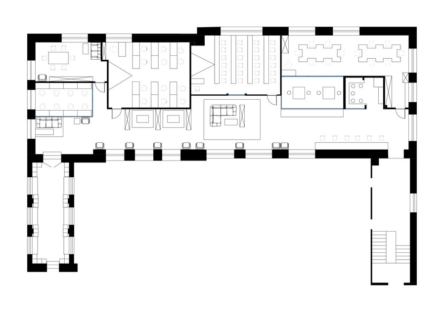 - мини-библиотека - одиночные места - акустические панели на стенах - звукоизоляционный потолок - стеклянные перегородки для визуального увеличения пространства