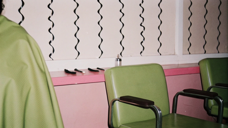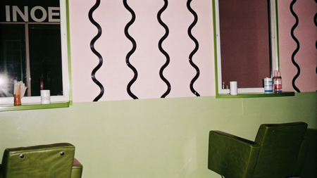 /The interior of the hairdressing salon «INOE», beige wallpaper with a pattern of black wavy lines, inside there are hairdressers' chairs, combs on the tables. (Recraft)