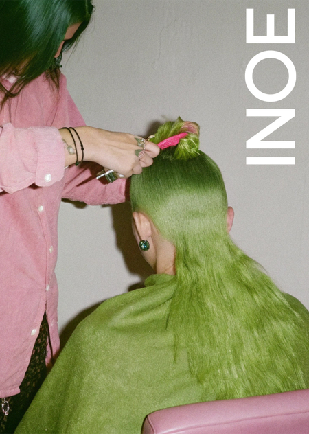 /Create a logo for the hairdressing brand «INOE». The logo should be made in a modern minimalist font. In the background there are aliens. (Recraft)