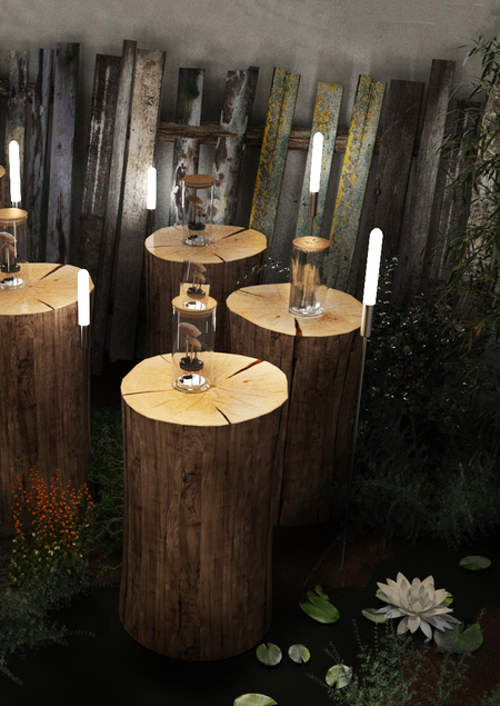 Стенды располагаются на россыпи торфа и земли, покрытой мхом. Посетители блуждают среди мерцающих огоньков, исходящих от светильников, похожих на камыши.