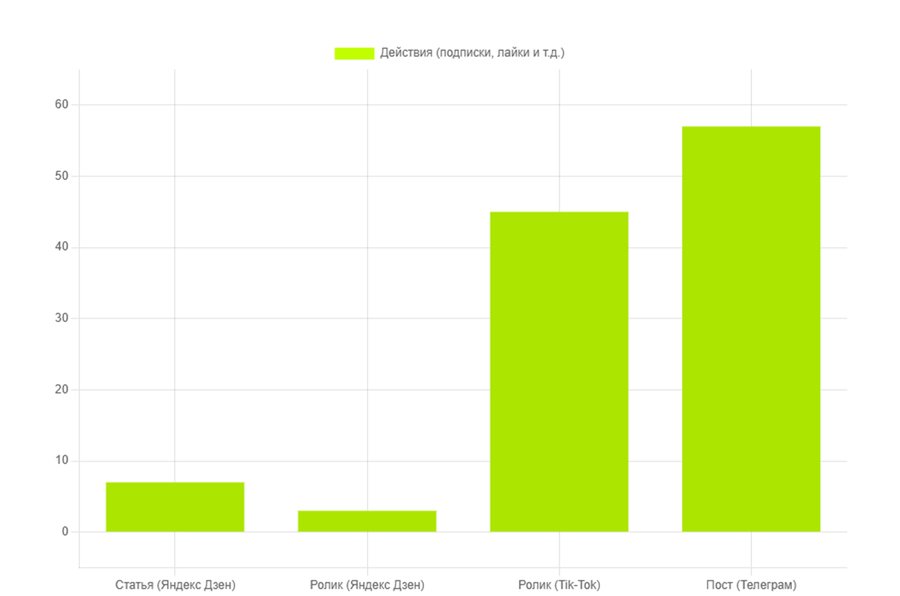 Вывод: TikTok показывает лучший отклик и вовлечённость по сравнению с другими платформами. Аудитория потенциально заинтересована, но контент нужно адаптировать под формат платформы — делать его короче, динамичнее и с элементами юмора или визуального хука.