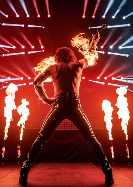 Обложка сделана в нейросети Ideogram от Google. Промт: Generate a picture about the Russian artist SHAMAN, use a red-blue-white palette, fire, a man from behind in latex pants with a microphone in. Photorealistic