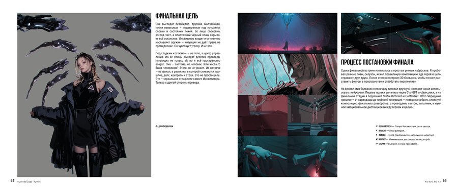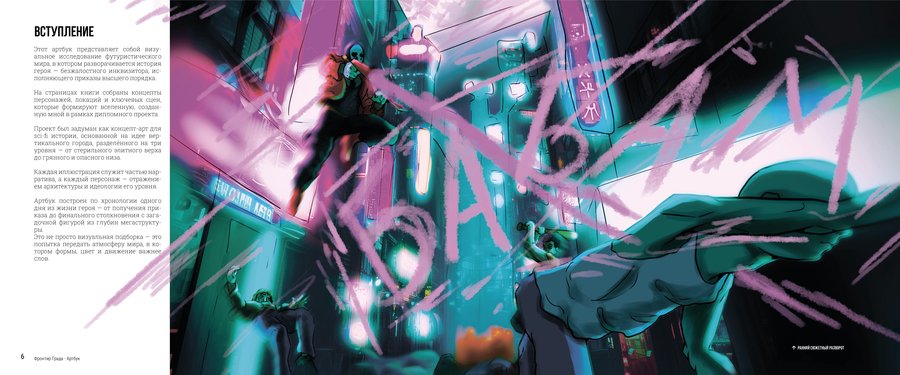 «Фронтир Града» — это авторский артбук, рассказывающий один день из жизни Инквизитора — хладнокровного агента власти в многоуровневом мире далёкого будущего. Проект объединяет лор, визуальные элементы мира, дизайн персонажей и транспорта, а также показывает процесс создания иллюстраций — от ручных скетчей до работы с 3D и нейросетями.