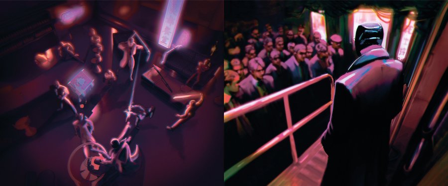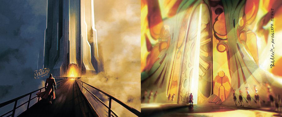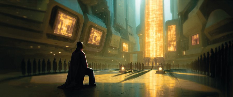 Инквизитор прибывает в зал, где получает новое задание. Блок раскрывает визуальный стиль правящего слоя и архитектуры верхнего уровня.