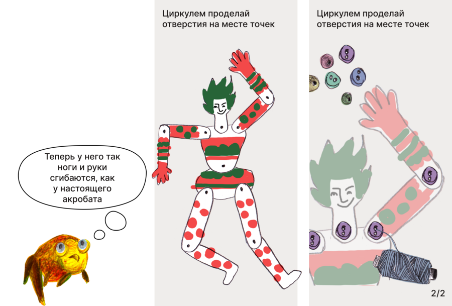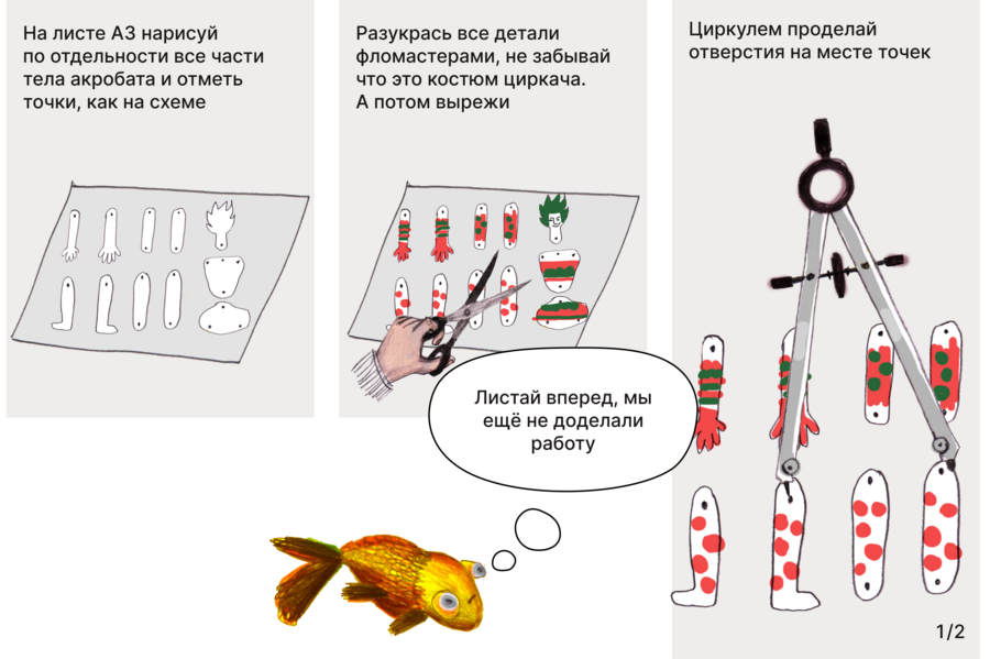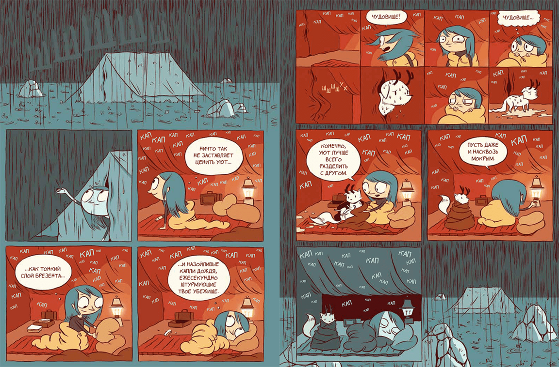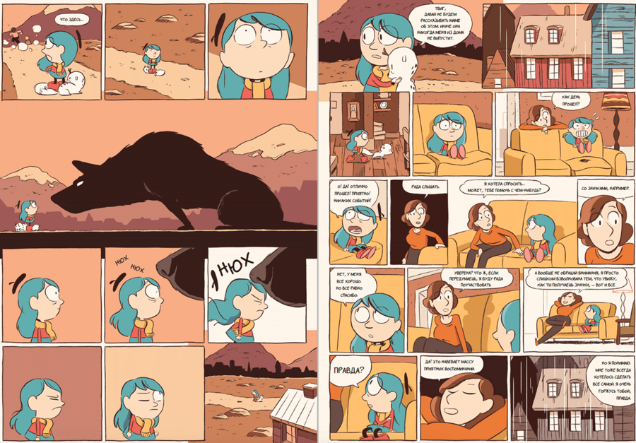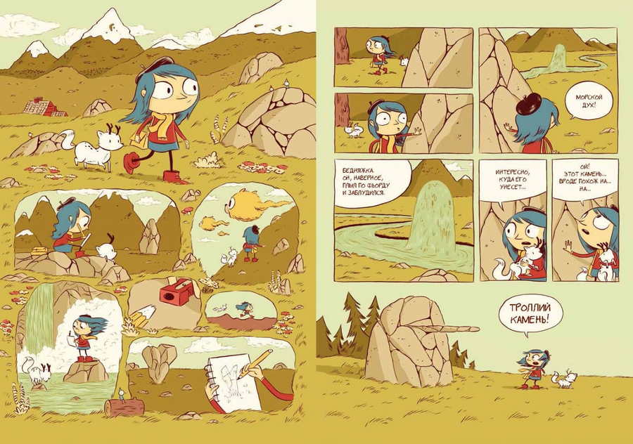 Переходя от картинки к картинки мы наблюдаем за тем, что происходит у персонажей. Обрати внимание на то, как художник-иллюстратор использует цвет. На каждой картинки количество цветов минимально.