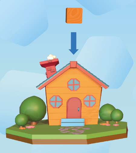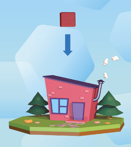 1. песчаный фундамент делает дом невысоким; 2. стальные балки делают толстыми стены; 3. деревянные стены дают треугольную крышу; 4. пластик делает окна угловатыми; 5. черепица делает окна маленькими; 6. труба из стали идет только вдоль стены.