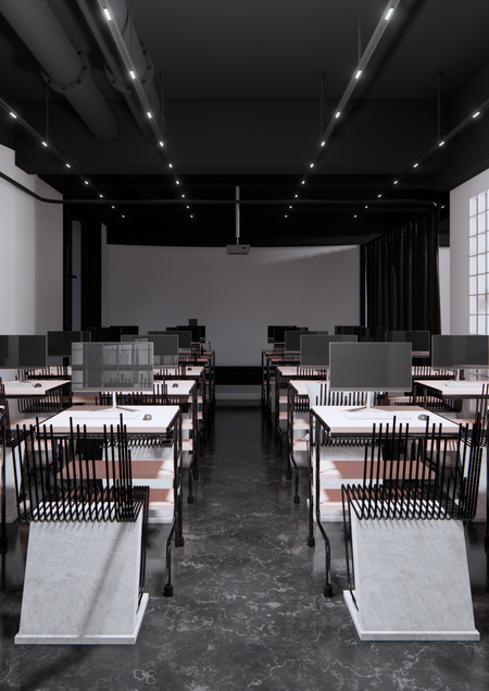 Кластер сделан в фирменных цветах Школы Дизайна НИУ ВШЭ — белый, серый и черный. Он не выбивается на фоне других помещений и в то же время несет собственную концепцию. Кластер выполнен в стиле модерна и баухауза — золотых эпох предметного дизайна и дизайна интерьера, и напоминает производственные ретро-сооружения