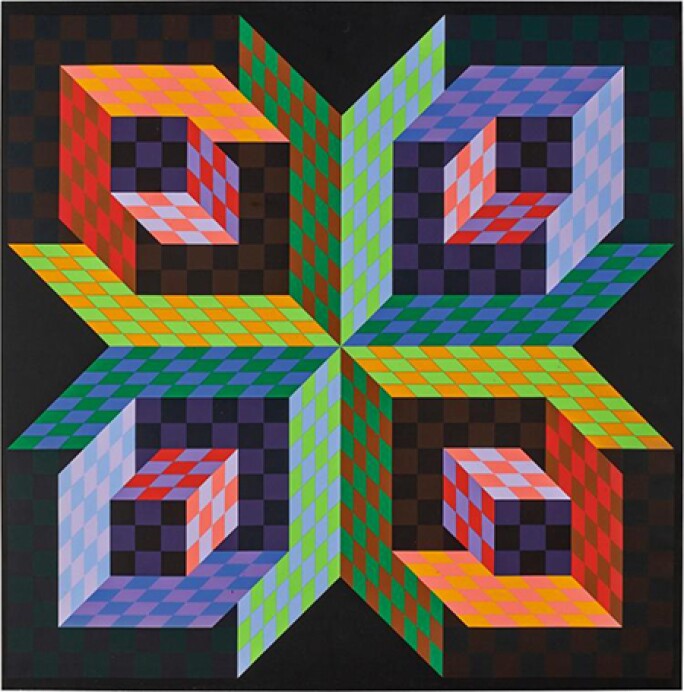 Интерьерные элементы приближены к визуальному стилю оп-арта, благодаря чему само пространство экспозиции напоминает одну большую работу оп-артиста.