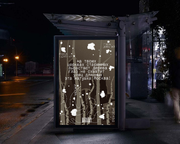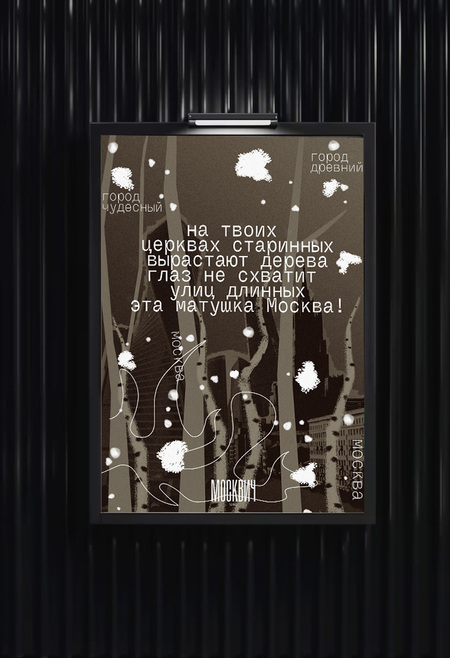 При разработке плаката были добавлены ретро элементы, чтобы создать ощущение уюта. Изображение переплетает в себе символы прошлого и настоящего: на фоне современных небоскребов соседствуют березы, создавая интересный контраст, и показывая одну из главных ассоциаций с Россией. Также на плакат был добавлен фрагмент стихотворения Федора Глинки «Москва»