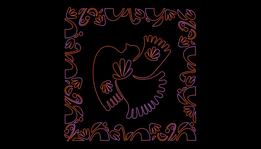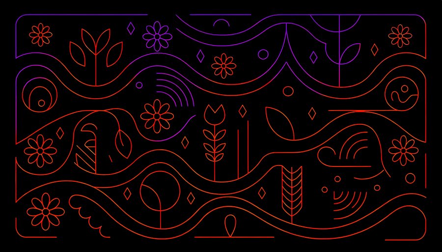 /create a wavy pattern with flowers, circles and abstract elements as in the reference. black background, gradient outlines (Recraft AI). Референс — второе фото
