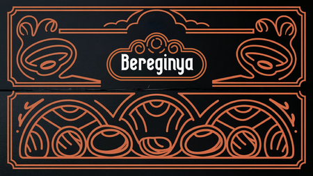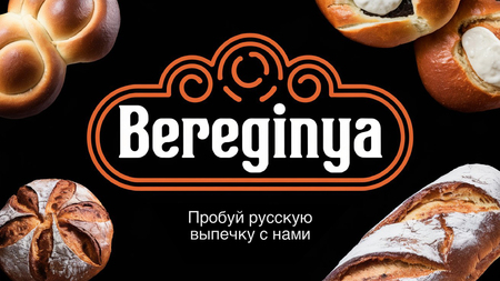 /Street graphic poster for the bakery brand «BEREGINYA». The poster features the brand logo, Russian-style design on a black background, orange rounded contour patterns are used. It depicts Russian buns. The poster advertises Russian baked goods (Ideogram)