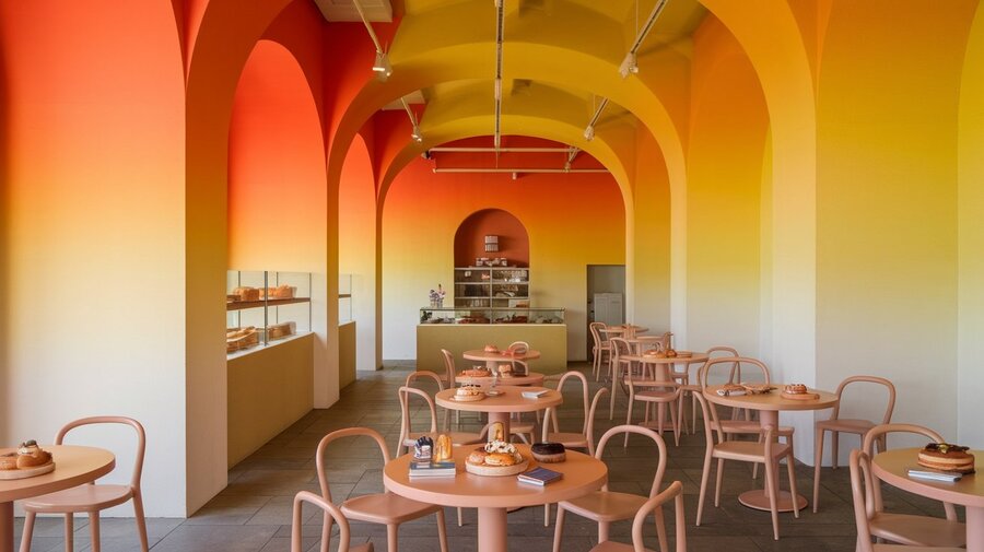 /create a bakery interior using gradient and orange and yellow colors in the design. inside there are tables where people sit and eat pastries (Ideogram)