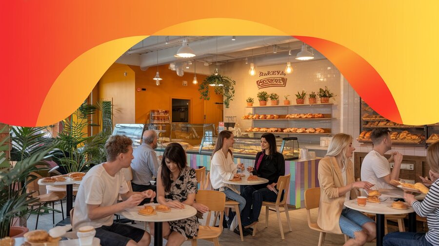 /A photo of a bakery interior with a gradient background of orange and yellow colors. There are tables inside where people sit and eat pastries. The pastries are displayed in a glass cabinet near the entrance. The floor is made of wooden planks. The lighting is warm (Ideogram)