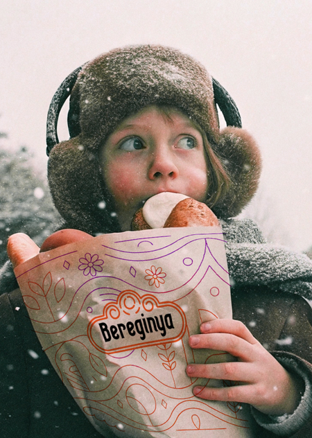 /create a photorealistic atmospheric image of a paper bag with Russian buns in the hands of a girl, a girl bites a Russian loaf. in the background is a Russian magical winter, it is snowing. a girl in an earflaps hat and with a Russian vibe (Recraft AI)