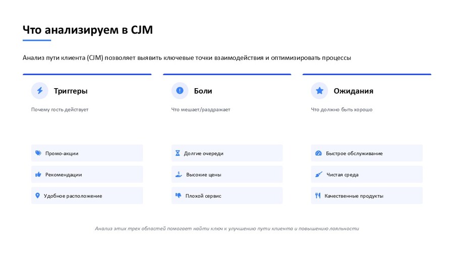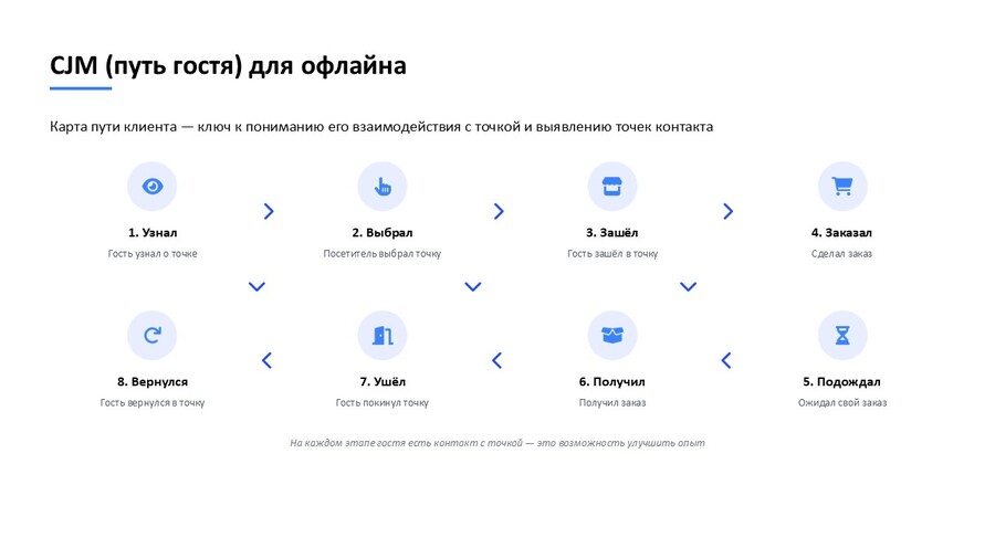 CJM показывает путь гостя от первого контакта до повторного визита. На каждом шаге есть: