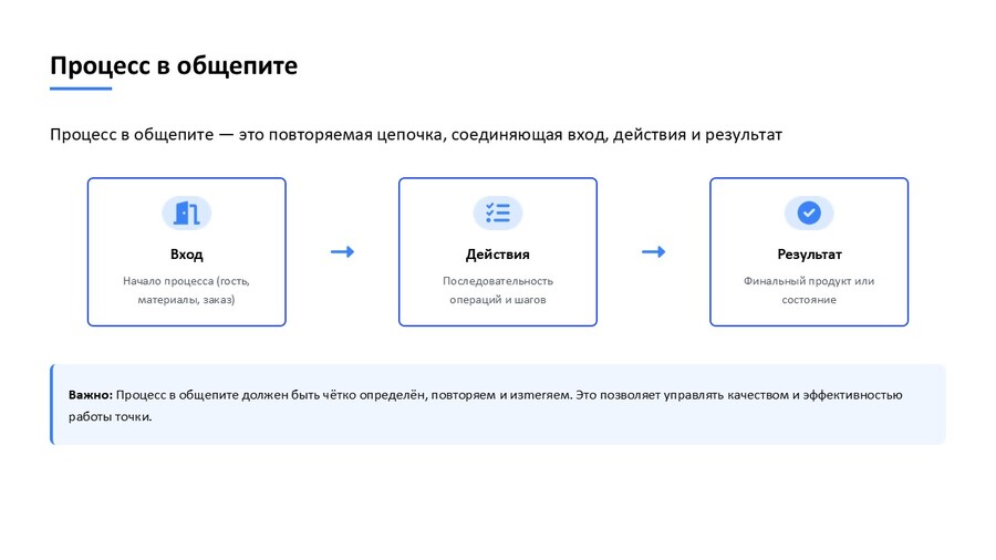 чётко определён (каждый шаг понятен), • повторяем (все сотрудники делают одинаково), • измеряем (есть показатели качества/скорости/денег).