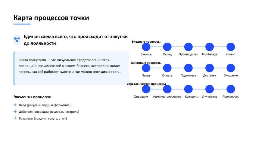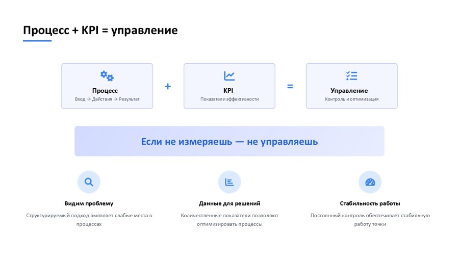 Когда процессы описаны, ты управляешь точкой как системой, а не тушишь пожары вручную.