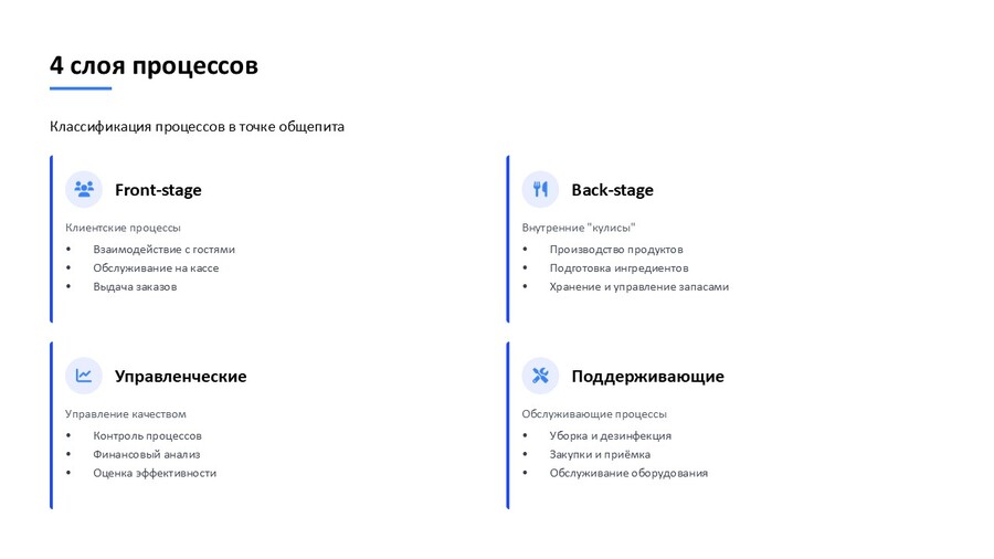 1. Front-stage — то, что видит гость (касса, выдача, зал, коммуникация). 2. Back-stage — кухня и склад «за кулисами». 3. Управленческие — контроль качества, финучёт, планирование. 4. Поддерживающие — уборка, сервис оборудования, приёмка и т. п.