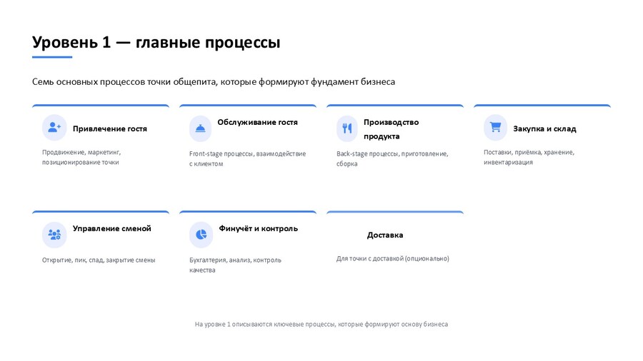 • что делает команда до открытия • как работаем в пике (кто за что отвечает) • что делаем в спаде (пополнение, подготовка) • как закрываем день и снимаем показатели