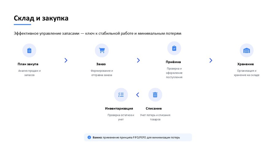 планирование закупа от продаж, а не «на глаз»; • FIFO (First-In, First-Out)/FEFO (First-Expired, First-Out) — первым уходит то, что пришло раньше/быстрее портится; • точная граммовка по техкартам — иначе фудкост всегда будет «ползти».