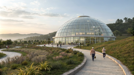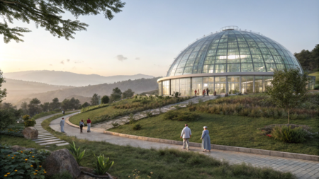 Promt: Create a space that represents a botanical garden organization focused on the reincarnation of people into plants. Show this building from the outside; it is large, spherical, with a depression in the center at the top, and it is bright and made of glass. Inside, a botanical garden is visible through the glass. Also, create a landscape design for this place; there are many paths along which elderly people in hospital pajamas walk, and the terrain is hilly. Нейросеть: Recraft AI.