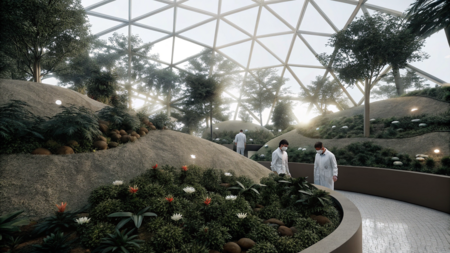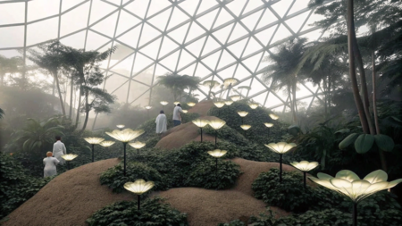 Promt: Create a space that represents a botanical garden—an organization dedicated to reincarnating people into plants. The plants should be small and unusual, magical in nature, and they should grow individually on small artificial hills. Add people in lab coats to the scene. Make the space under a glass dome. Нейросеть: Recraft AI.
