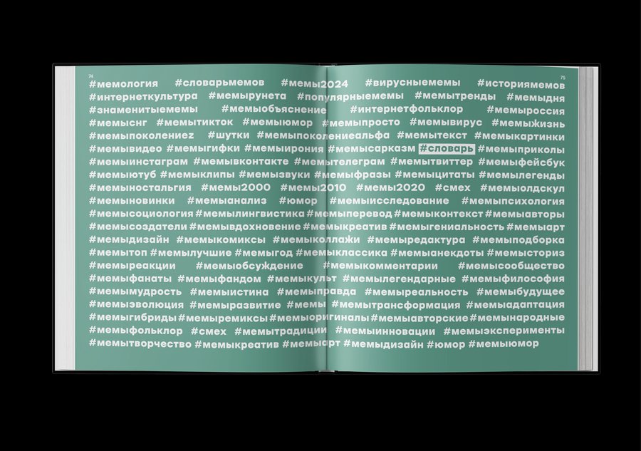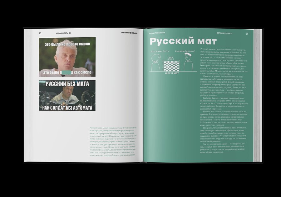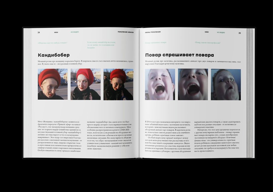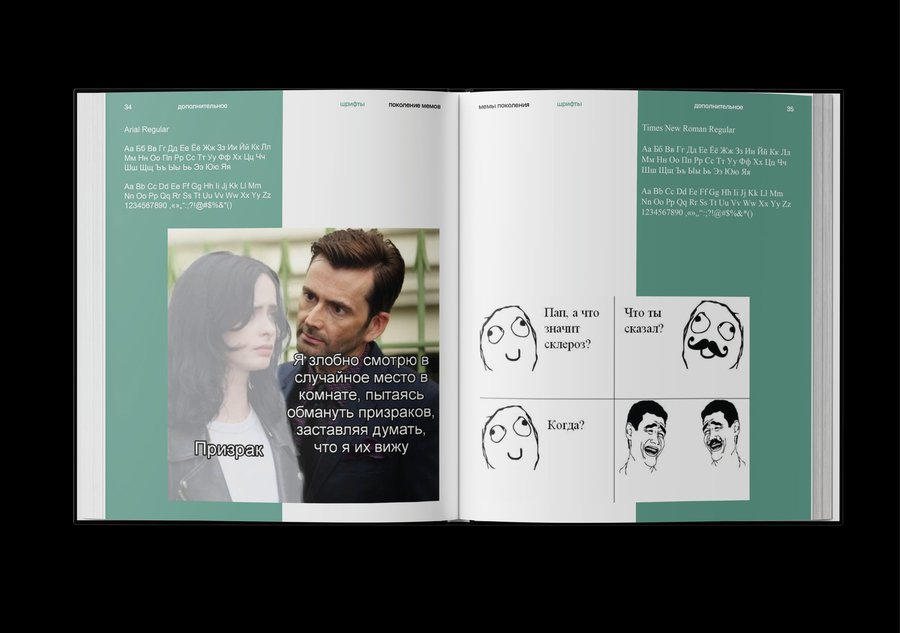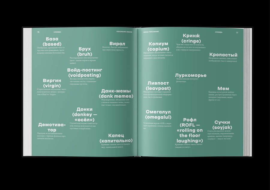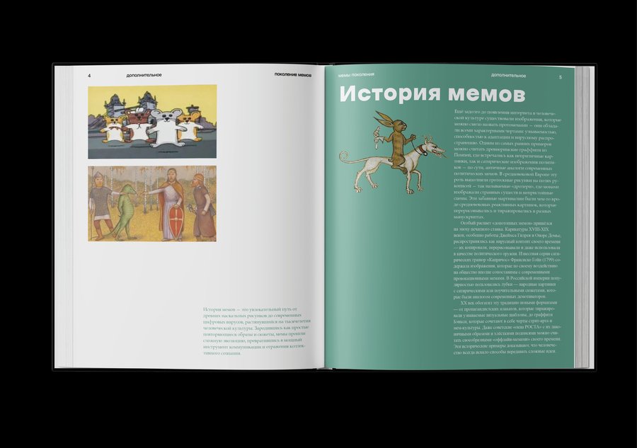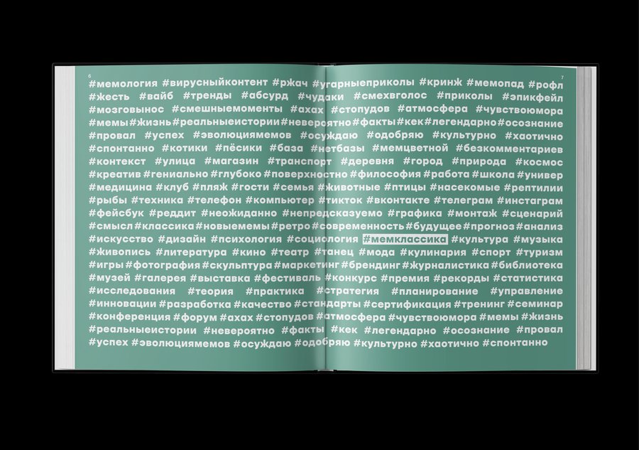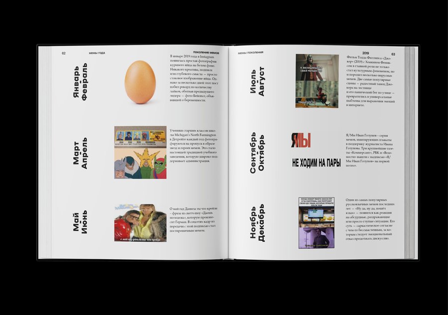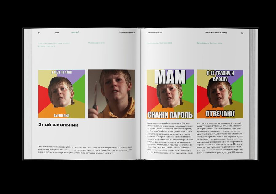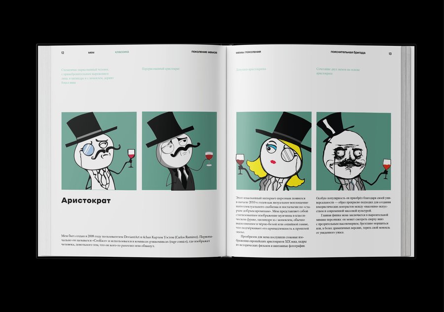 Книга со сложной структурой, в которой представлены культовые мемы, смешные картинки, текстовые пояснения и многое другое. Все это погружает в контекст эпохи и создает полную картину современной медиа среды