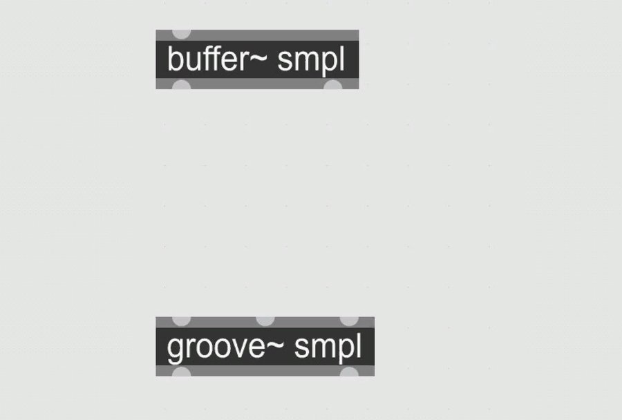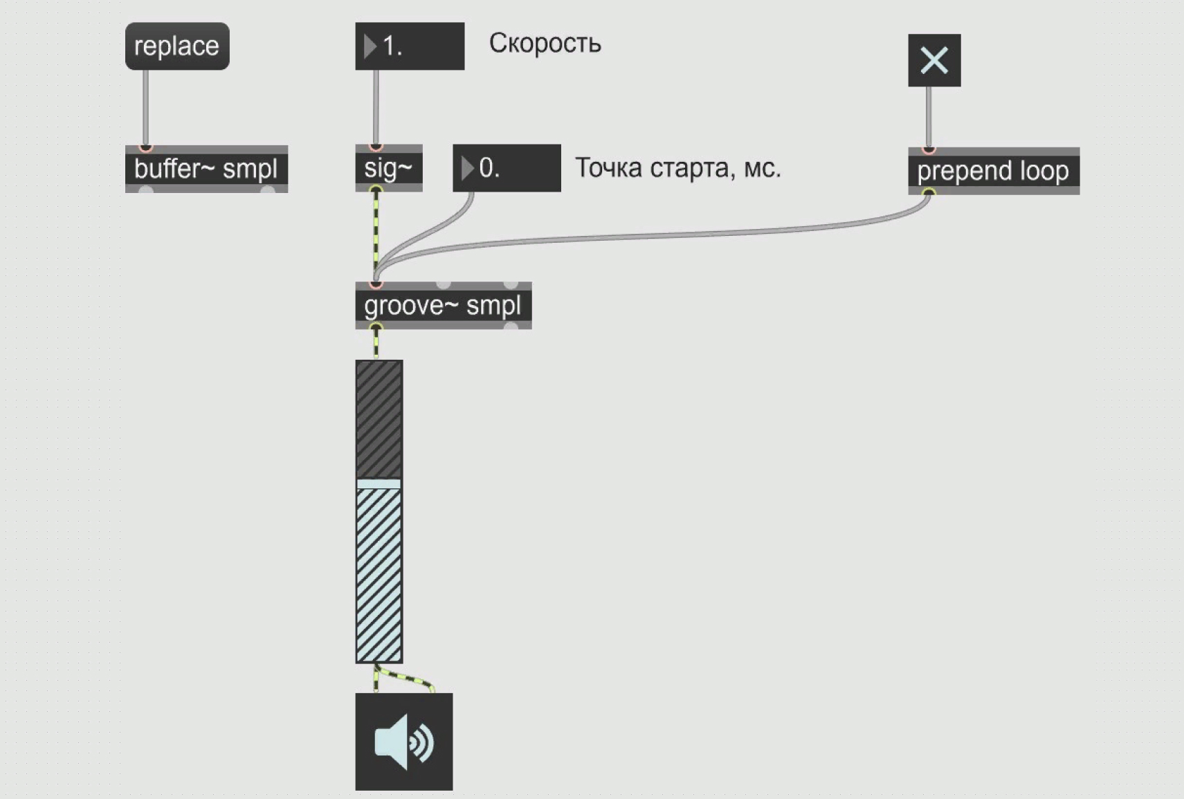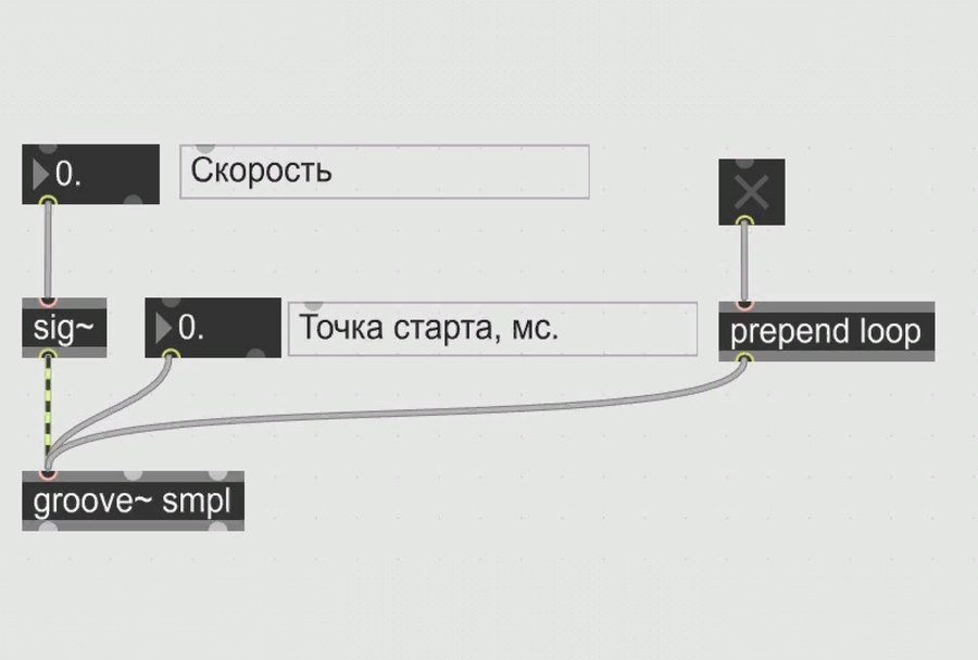 Использованные объекты: toggle transport metro counter route button flonum message waveform~ sig~ comment groove~ buffer~ biquad~ filtergraph~ gain~ prepend ezdac~