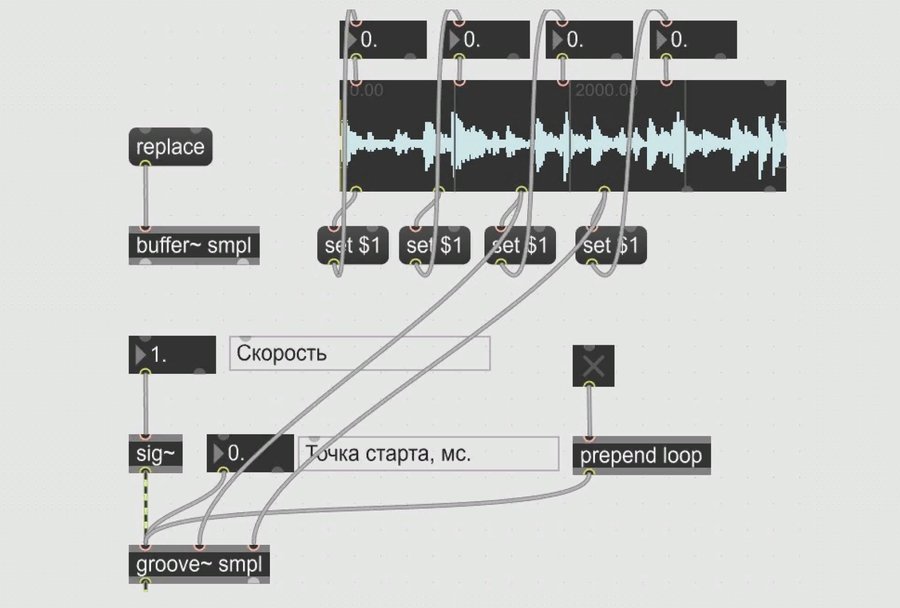 Студентами были освоены знания о работе с семплами в программе Max/MSP. Задача домашней работы была в том, чтобы сделать патч, использую только готовые аудио фрагменты. Рассмотрим на примере патча, что можно сделать используя только объекты, рассмотренные на лекции.