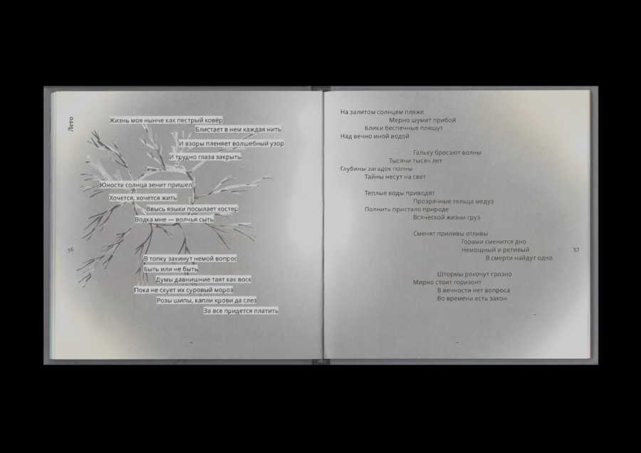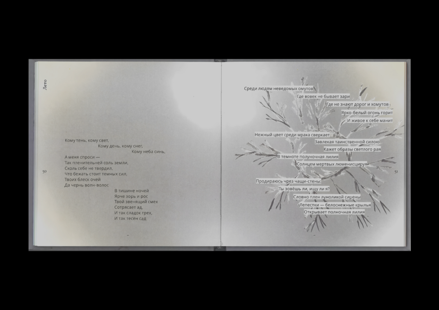 Расстановка текста экспериментальная и соответствует ритму стихотворения. Есть вкрапления цвета по углам страниц: с каждым временем года цвет меняется, а количество цветных углов увеличивается.
