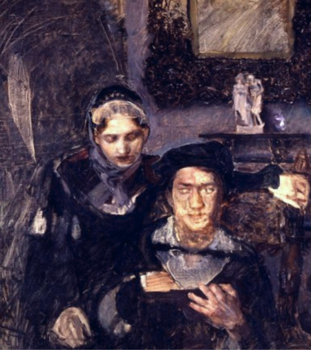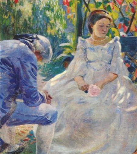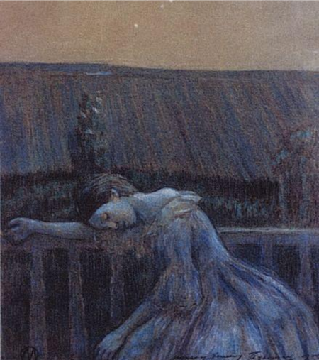 Он спутывает, размывает эмоции, накал страстей спадает, и художник стремится к изображению большего спектра печальных эмоций: скуки, тоски — которого добивается теми же приемами, что и Врубель: цвет/мозаичность/персонажи погруженные в себя.
