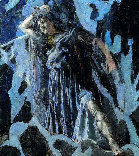 Одежды героя растеклись по полотну, подобно воде, и стали источником сил для внешней стихии, цветов, которые будто подпитываются им, приобретая лилово-сероватый оттенок.