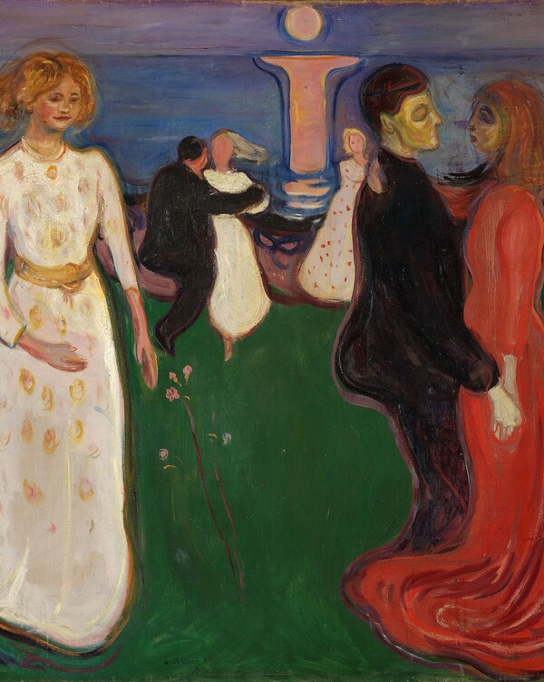 По представлениям художника вся жизнь — это танец. На картине изображён летний праздник: юноши и девушки танцуют парами на берегу моря в лунную ночь. Среди празднующих выделяются три женские фигуры в платьях символических цветов — белом, красном и чёрном. Девушка в белом стоит слева, поодаль от танцующих, рука её тянется к цветку на высоком стебле. Женщина в красном танцует с мужчиной, которому художник придал собственные черты: они изображены в самом центре картины. Наконец, женщина в чёрном стоит возле правого края картины: у неё, как и у девушки в белом, нет партнёра, и она ревниво смотрит на танцующих [15]. Как и в «Сфинксе» все три женщины демонстрируют зрителям три ипостаси женского возраста: в белом — начало взрослой жизни и рождение любви, в красном — бурная жизнь и любовь, что горит ярким огнём, в чёрном — закат всего, тоска по прошлому, невозможность вернуть былое.
